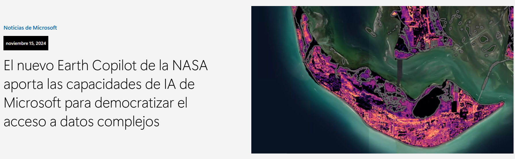 «Earth Copilot” es una aplicación desarrollada por Microsoft en colaboración con la NASA que utiliza la Inteligencia Artificial (IA) gracias a la cual se puede explorar y visualizar grandes cantidades de datos científicos de Teledetección mediante consultas realizada s de manera sencilla en lenguaje natural.