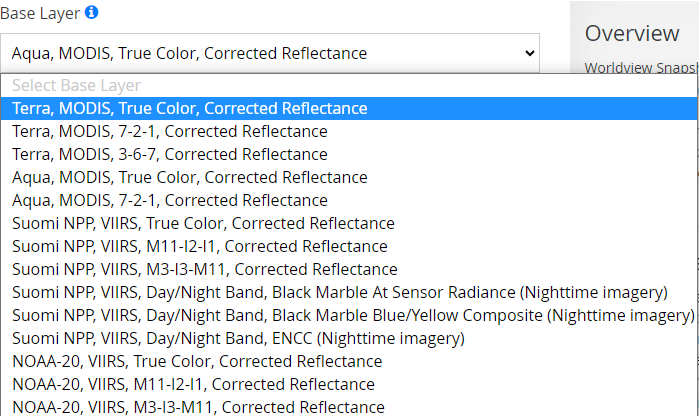 Para acceder al recurso, tendremos que acceder a este enlace. Dentro de la web tendremos unos primeros desplegables para poder elegir el tipo de proyección que queremos de la imagen (la proyección geográfica por defecto nos descargará las imágenes en EPSG 4325, la fecha de descarga de la imagen (dependerá del satélite y del tipo de composición que queramos descargar), la imagen con la composición que queramos descargar, y por último si queremos poner alguna capa de superposición, como los incendios, las líneas de costa, las fronteras o las carreteras. Puedes acceder a información acerca del rango de fechas y la utilidad de cada tipo de composición de bandas haciendo click en este enlace.